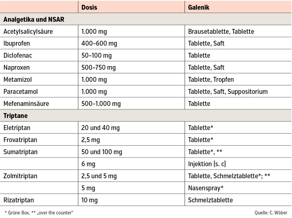 Leicht- bis mittelgradige Attacken werden primär mit Analgetika oder nichtsteroidalen Antirheumatika (NSAR) behandelt (Tab.). Falls mit diesen Maßnahmen keine ausreichende Besserung erreicht wird oder die mangelnde Wirksamkeit schon bekannt ist, werden Triptane eingesetzt (Tab.).