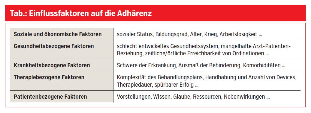 Die Therapieadhärenz bei Asthmapatient:innen ist insofern schwieriger zu erzielen als bei anderen chronischen Erkrankungen, als hier Intervalle von Beschwerdefreiheit vorliegen. Es fällt – vor allem jungen und berufstätigen Patient:innen – schwer, regelmäßig ihre Inhalationen zu verwenden, wenn sie aktuell keine Symptome verspüren. Gerade bei sehr jungen Patient:innen fehlt oft zum einen die Krankheitseinsicht, zum anderen besteht nicht selten auch ein sozialer Druck. (Es wird als „uncool“ angesehen, den „Asthmaspray“ regelmäßig oder auch nur vor dem Sport nehmen zu müssen.) Meistens jedoch werden Medikamente schlichtweg vergessen.