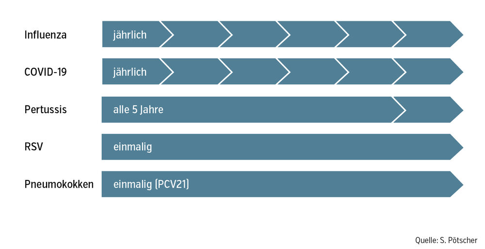Zuletzt gilt es zu betonen, dass unabhängig vom gewählten Therapieschema die Prävention von Exazerbationen zentral ist. Insbesondere die Impfprävention ist hierbei von großer Wichtigkeit. Patient:innen mit Asthma bronchiale gehören a priori zu einer vulnerablen Gruppe hinsichtlich respiratorischer Infektionserkrankungen, und Impfungen gegen etwa Influenza, Sars-CoV-2, Pneumokokken, RSV und Pertussis sollten durchgeführt bzw. je nach Impfung (Abb.) regelmäßig aufgefrischt werden.