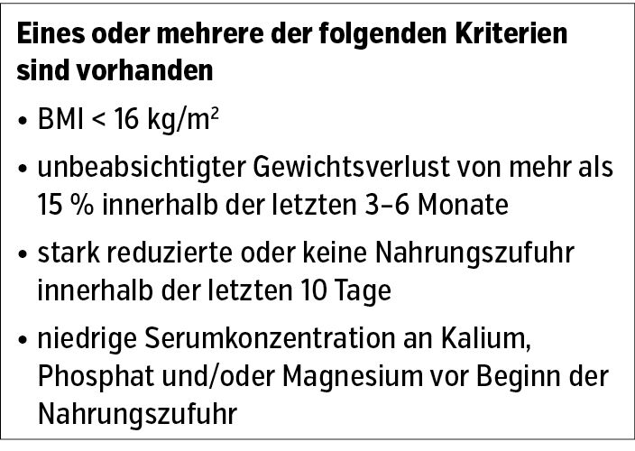 Tab.: Identifikation von Risikopatient:innen für die Entwicklung eines Refeeding-Syndroms