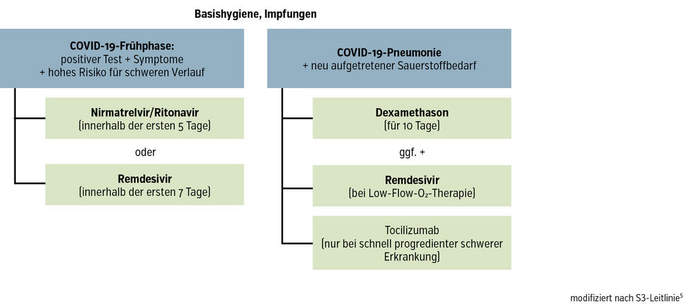 Die Entscheidung für eine medikamentöse Therapie ist von der klinischen Symptomatik, den Vorerkrankungen der Patient:innen, der Krankheitsphase und der SARS-CoV-2-Variante abhängig. Auch Medikamenteninteraktionen und Kontraindikationen für antivirale Therapien müssen berücksichtigt werden.