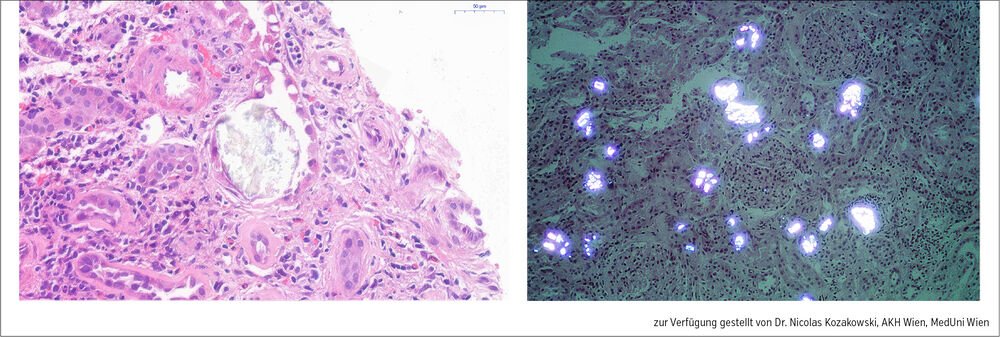 Abb.: Nierenbiopsie bei primärer Hyperoxalurie: linkes Bild: PAS-Färbung mit Kristallen im Tubulus; rechtes Bild: doppelbrechende Oxalat-Kristalle im polarisierten Licht