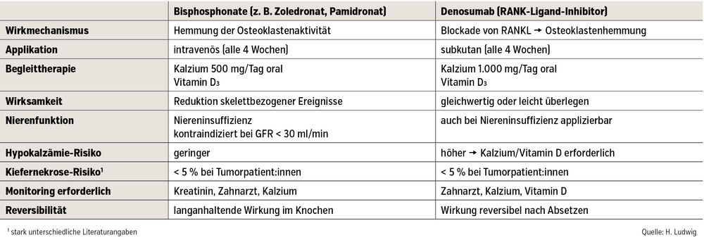 Tab.: Vergleich von Bisphosphonaten und Denosumab zur Osteoprotektion im Rahmen von Tumorerkrankungen