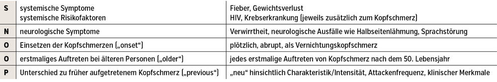 Das wichtigste Instrument für die Diagnose und die Einschätzung des Gefahrenpotenzials von Kopfschmerzen ist die Anamnese. Dabei gilt es, Red Flags zu beachten, die eine sofortige weitere Abklärung erforderlich machen. Ein gut anzuwendendes und verlässliches Instrument dafür sind die SNOOP-Kriterien (Tab.). Ist eines oder mehrere dieser Kriterien erfüllt, sollte eine weitere Abklärung der Kopfschmerzen erfolgen.