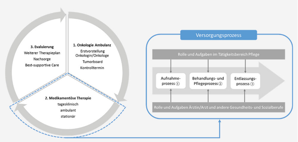 In der Abbildung ist der Behandlungspfad während einer medikamentösen Therapie (links) sowie der dazugehörige Versorgungsprozess (rechts) dargestellt. Der Teilbereich medikamentöse antineoplastische Therapie wird folgend näher aus der Perspektive der Pflege beleuchtet. Hier werden die Tätigkeiten von stationären und tagesklinisch tätigen DGKP wie auch spezialisierten Pflegekräften (z.B. Cancer Nurse) beschrieben – die jeweiligen Aufgaben werden patientenbezogen und settingspezifisch durchgeführt. Zu den Teilbereichen im Versorgungsprozess (Abb., rechts) wird als Überblick ein Auszug an pflegerischen Tätigkeiten beschrieben.