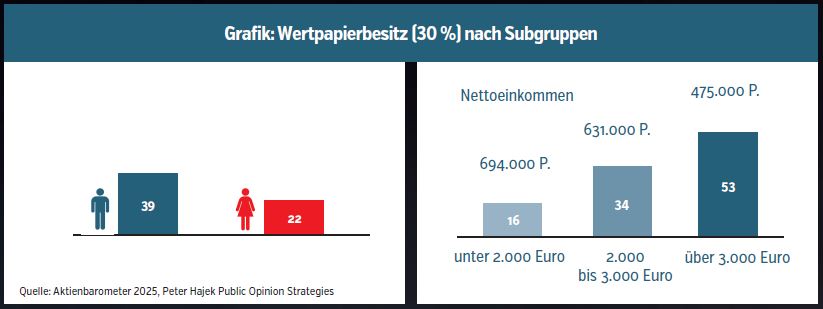 Zurück nach Österreich: Hierzulande ist in puncto Geldanlage das Sparbuch – eigentlich müsste man korrekterweise Sparkonto sagen – noch immer die Nummer 1. Das geht aus einer jüngst veröffentlichten, repräsentativen Online-Umfrage des Meinungsforschungsinstituts forsa im Auftrag der Union Investment hervor. Demnach besitzen 83% der Befragten ein Sparbuch, auf Platz 2 folgt ein Tagesgeldkonto (50%), Platz 3 belegt die Kapital-Lebensversicherung mit einer Nennung von 42%. An vierter Stelle liegen bereits Investmentfonds, die laut der Befragung bereits 40% der Befragten ihr Eigen nennen. Weitere 37% geben an, dass sie einen Bausparvertrag haben. Ein durchaus erstaunliches Ergebnis, denn laut dem im März dieses Jahres veröffentlichten Aktienbarometer, einer jährlichen Umfrage im Auftrag der Industriellenvereinigung, erklärten lediglich 30% der befragten Österreicher:innen, dass sie in Wertpapiere (Aktien, Anleihen oder Investmentfonds und ETFs) investieren. In beiden Studien zeigte sich, dass Männer in puncto Anlage deutlich stärker auf Wertpapiere setzen als Frauen (siehe dazu Grafik: Wertpapierbesitz nach Geschlecht bzw. Einkommen). Vor allem in den Einkommensgruppen ab 3.000 Euro netto spielt der Wertpapierbesitz eine große Rolle.