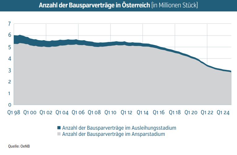 Doch das hat sich geändert. Ende 2024 gab es in Österreich laut OeNB noch 2.990.496 Bausparverträge im Ansparstadium — um 3,7% weniger als Ende 2023. Ende März 2025 lag die Anzahl der Bausparverträge bei 2.943.513 Stück und erreichte somit den geringsten Wert seit 1997 (siehe dazu Grafik 1). Umgerechnet auf die österreichische Bevölkerung bedeutet dies, dass aktuell nur mehr rund ein Drittel einen Bausparvertrag hat.
