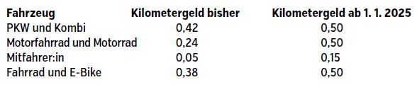 Für das Jahr 2025 wurde außerdem eine Anpassung des amtlichen Kilometergeldes vorgenommen, nachdem die letzte Anpassung für betriebliche Fahrten mit dem PKW oder Kombi laut der Wirtschaftskammer Österreich schon 16 Jahre zurückliegt. Ab 1.1.2025 liegt das amtliche Kilometergeld nunmehr bei € 0,50 (mehr dazu im Infokasten zum amtlichen Kilometergeld).