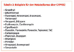 Insbesondere Gerinnungshemmer haben ein sehr hohes Wechselwirkungspotenzial. Generell vermeiden sollten Patienten mit Antikoagulation NSAR, Glukokortikoide, SSRI und SNRI. Über Ausnahmen im Einzelfall entscheidet der Arzt. Von besonderer Relevanz an der Tara sind Arzneimittel aus dem OTC-Bereich. Vielfach unterschätzt wird das Interaktionspotenzial zahlreicher Phytopharmaka, Tabelle 2 gibt diesbezüglich einen exemplarischen Überblick. Marcoumar®-Patienten sollten außerdem grünes Gemüse aufgrund des hohen Vitamin-K-Gehaltes nicht in übermäßigen Mengen konsumieren (Cave: Kohlsuppendiät!). Die Mehrheit der Interaktionen ergibt sich durch eine gemeinsame Verstoffwechselung über Cytochrom P450 beziehungsweise die Untergruppen 2C9, 3A4 und 2C19 (Tab. 3).