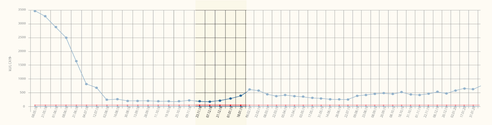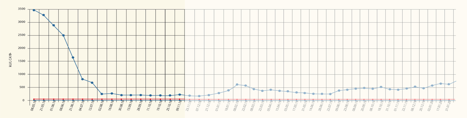 Die Behandlung mit Taxanen wird üblicherweise nach 6 Zyklen beendet und der Patient erhielt in der Erhaltungsphase eine hochdosierte Gem-Monotherapie über 3 Zyklen von November 2018 bis Jänner 2019. In der Erstlinie hatte der Patient einen ECOG PS von 0, es trat keine Neuropathie auf und die Lebensqualität konnte konstant gut gehalten werden. Mit der Gem/nab-Pac-Therapie wurde eine stabile Erkrankung (Stable Disease, SD) erreicht, mit korrelierendem Rückgang des Tumormarkers CA19-9