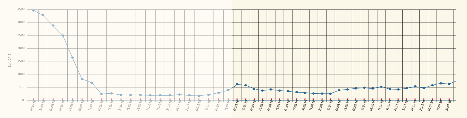 Im Jänner 2019 trat ein Progress auf, woraufhin die Umstellung der Therapie auf nanoliposomales Irinotecan Nal-Iri+5-FU/LV2 erfolgte. Nal-Iri+5-FU/LV wird als einzige Evidenz-basierte Behandlungsoption in der Zweitlinie nach den ESMO-Guidelines1 mit Kategorie 1 empfohlen und erreicht dank seiner pegylierten nanoliposomalen Form eine dreifach verstärkte Tumorhemmung gegenüber konventionellem Irinotecan.3 Zum Therapiestart hatte der Patient einen ECOG PS von 0–1. Die Behandlung mit nal-Iri+5- FU/LV wurde, bei sehr guter Verträglichkeit, über ein Jahr bis Jänner 2020 fortgesetzt. Die Therapie konnte somit im Vergleich zur Erstlinie um 3 Monate länger gegeben werden, wobei sich auch die Lebensqualität (QoL) unter nal-Iri+5-FU/LV positiv entwickelte: Der Patient hatte 5 kg an Gewicht zugenommen und es kam zu einer Besserung der Fatigue. Im November wurde erneut eine SD erreicht mit konstant niedrigem Verlauf des CA19-9 (Abb. 2). Am Ende der zweiten Linie war der Patient wieder bei einem ECOG PS von 0.