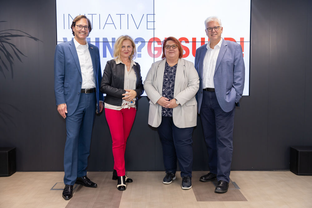 v. l. n. r.: Mag. Philipp Lindinger, Wund?Gesund!-Sprecher; Mag.a Elisabeth Potzmann, Präsidentin des Österreichischen Gesundheits- und Krankenpflegeverbandes (ÖGKV); Mag.a Martina Laschet, Wund?Gesund!-Sprecherin; Andreas Huss, MBA, Obmann der Österreichischen Gesundheitskasse (ÖGK) und Vorsitzender der Dachverbandskonferenz; © Foto: Initiative Wund?Gesund!/APA-Fotoservice/Juhasz