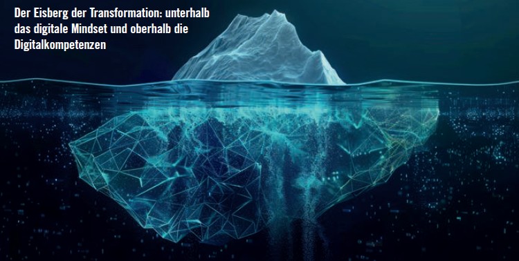 Unabhängig von der Branche gibt es ein Set an Zukunftskompetenzen, das wichtig ist, um mit der aktuell stattfindenden Multitransformation umzugehen: Dieses Set besteht aus der Kombination von digitalem Mindset und Digitalkompetenzen, wobei digitales Mindset die Grundlage bildet. Hierbei kann auch vom Eisberg der Transformation gesprochen werden: Unterhalb der Wasseroberfläche befindet sich das digitale Mindset als nicht direkt sichtbares Element und oberhalb der Wasseroberfläche, also im sichtbaren und kleineren Bereich, sind die Digitalkompetenzen anzusiedeln. Ohne das Fundament könnte der Eisberg also nicht existieren. Digitales Mindset sind Persönlichkeitsdimensionen, die erfolgskritisch für den Umgang mit Transformation sind und per se nichts mit Technologie zu tun haben.