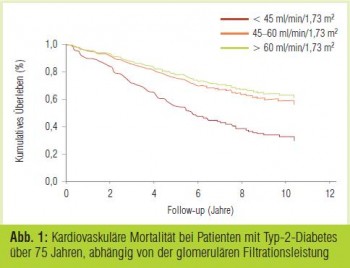 Zu einem ähnlichen Ergebnis kamen Pugliese et al. (EASD 2011; Abstr 38) in einer Analyse der italienischen RIACE-Kohorte (n = 15.773), in der 57 % der Typ-2-Diabetiker mit chronischer Nierenschädigung (definiert GFR < 60 ml/min/1,73 m2) normoalbuminurisch waren. Im Vergleich zu Patienten mit normaler GFR (mit oder ohne Albuminurie) war dieser Phänotyp stärker mit kardiovaskulären Ereignissen assoziiert (Odds Ratio [OR] = 1,52 vs. 1,20), allerdings nicht in dem Ausmaß wie das kombinierte Auftreten von reduzierter Filtrationsleistung und Albuminurie (OR = 1,90). Interessanterweise war die nichtalbuminurische Nieren – erkrankung stärker mit koronaren Ereignissen assoziiert, während bei Patienten mit Albuminurie, aber normaler GFR vermehrt zerebrale und periphere Gefäßkomplikationen auftraten.