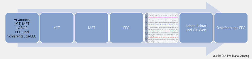 Die Basisdiagnostik stützt sich traditionell auf drei Säulen: die klinische Anamnese, das Elektroenzephalogramm (EEG) und die strukturelle Bildgebung mittels Magnetresonanztomografie (MRT) (Abb. 1).