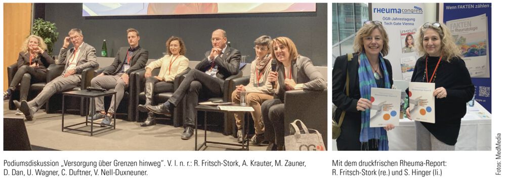 In der daran anschließenden Podiumsdiskussion „Rheumatologische Versorgung über Grenzen hinweg – Gemeinsamkeiten erkennen, Unterschiede verstehen, voneinander lernen“ diskutierten Priv.-Doz.in Dr.in Christina Duftner, PhD (Präsidentin der ÖGR), Dr.in Diana Dan (Präsidentin der Schweizerischen Gesellschaft für Rheumatologie, SGR), Prof. Dr. Ulf Wagner (Präsident der Deutschen Gesellschaft für Rheumatologie, DGRh), Michael Zauner, MSc (Präsident der Österreichischen Gesellschaft für rheumatologische Gesundheitsberufe, ÖGRG), Dr. Andreas Krauter, MBA (Leiter der Abteilung Medizinischer Dienst und Versorgungsinnovation, Österreichische Gesundheitskasse, ÖGK), sowie Priv.-Doz.in Dr.in Ruth Fritsch-Stork, PhD, unter der Moderation von Priv.-Doz.in Dr.in Valerie Nell-Duxneuner (Past-Präsidentin der ÖGR) (siehe Foto links).