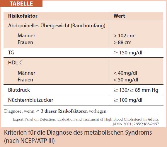 Bei genauer Analyse des Risikoprofils von Adipösen fällt jedoch auf, dass der Fettverteilung eine wichtigere Rolle zuzukommen scheint. Bereits seit dem Anfang des letzten Jahrhunderts fiel ein Zusammenhang zwischen dem Körpergewicht und anderen Risikofaktoren wie Hypertonie und Diabetes auf. In den letzten Jahrzehnten entwickelte sich daraus das Konzept des Stoffwechsel- bzw. metabolischen Syndroms (MS), welches diverse Risikofaktoren wie Hypertonie, Dyslipidämie und Diabetes in Verbindung mit einer zentralen Fettverteilung umfasst. Von den diversen Definitionen ist jene nach NCEP/ATP III die praktikabelste und am besten validierte (Tab.). Zur Prävalenz des MS liegen aus den USA rezente Zahlen vor. Sie beträgt in der Gesamtpopulation bereits 40 %, wobei eine starke Zunahme bei jungen Frauen in den letzten Jahren auffällt. Die Betroffenen haben zudem ein 10-fach höheres Diabetesrisiko und ein verdoppeltes Risiko für koronare Herzkrankheit.