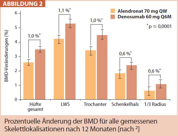 Signifikante Zunahme der Knochendichte von Denosumab gegenüber einem Standardbisphosphonat: In einer doppelblinden Phase-III-Studie über 12 Monate wurde Denosumab (60 mg subkutan alle 6 Monate) im Vergleich mit Alendronat (70 mg wöchentlich) hinsichtlich des Effektes auf die Knochendichte bei nicht vorbehandelten, postmenopausalen Frauen mit Osteoporose untersucht. Die Ergebnisse zeigten, dass die Therapie mit Denosumab zu einer signifikanten Zunahme der Knochendichte im Vergleich zu Alendronat führte, und zwar an allen untersuchten Stellen des Skeletts, wie Hüfte, Lendenwirbelsäule, Trochanter, Schenkelhals und distalem Radius (Abb. 2). In Bezug auf Nebenwirkungen gab es auch keine Unterschiede zwischen den beiden Therapiegruppen.2