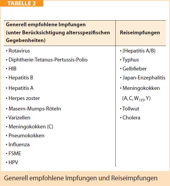 Bei der Erstellung der individuellen Impfpläne ist auf die Aktualisierung der im österreichischen Impfplan empfohlenen (Download www.bmgfj.gv.at) und die reisezielspezifischen Impfungen zu achten. Bezüglich der Gelbfieberimpfung sind allfällige Impfvorschriften, jedoch auch die Kontraindikationen zu beachten. Tab. 2 soll einen Überblick über die generell empfohlenen Impfungen und die Reiseimpfungen geben. Über Einschränkungen im Zusammenhang mit schwangeren Reisenden siehe unten.