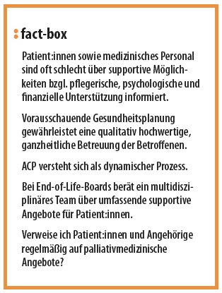 Unter dem Begriff „Advance Care Planning“ (ACP) wird eine vorausschauende gesundheitliche Planung nach den Werten und Vorstellungen der Patient:innen verstanden.6 Es sollen insbesondere Behandlungsentscheidungen und Maßnahmen zur häuslichen Obsorge getroffen werden, welche die individuellen Interessen der Betroffenen widerspiegeln. Das Konzept der gesundheitlichen Versorgungsplanung ist mittlerweile fester Bestandteil des Gesundheitswesens in den Vereinigten Staaten, Großbritannien, Australien und Neuseeland.6 Hierorts fehlen jedoch noch grundlegende Strukturentscheidungen, um dieses Angebot der Bevölkerung bekannt zu machen und flächendeckend anbieten zu können.