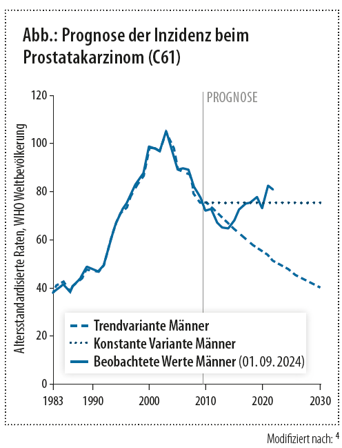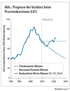 Die altersstandardisierte Rate der Neuerkrankungen stieg bis 2003 stark an. Nach einer Phase mit rückläufigen Zahlen bis 20141, 2 kam es wieder zu einem Anstieg (172,8 je 100.000 Männer im Jahr 2023).3 In den letzten Jahren lagen die beobachteten Raten deutlich über der Prognose, was auf veränderte Screening-Maßnahmen, eine erhöhte diagnostische Sensitivität sowie optimierte Erfassungsroutinen im Meldesystem hinweist (Abb.). Die Sterberate ging seit dem Höchststand im Jahr 1999 deutlich zurück, von 66,1 auf 38,1 von 100.000 in 2023. Der zeitliche Verlauf, die Rate je Bundesland sowie das Tumorstadium bei Diagnose sind stark von den jeweiligen Screening-Standards abhängig.1, 2