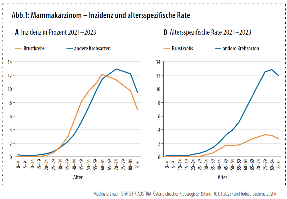 Mit rund einem Drittel aller malignen Neuerkrankungen ist das Mammakarzinom die mit Abstand häufigste Krebserkrankung der Frau in Österreich. Die meisten Neuerkrankungen werden in der Altersgruppe 60–64 Jahre diagnostiziert. Mit dem höchsten Risiko einer Brustkrebsdiagnose ist allerdings die Altersgruppe 75–79 Jahre konfrontiert.