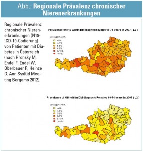 Die beschriebenen Limitationen in der Diagnose der frühen Nierenerkrankung erklären auch, warum es keine guten Daten zur Epidemiologie, speziell zu den Risikofaktoren und der geografischen Verteilung der CKD in Österreich sowie in fast allen anderen europäischen Ländern gibt. In Kooperation mit dem Hauptverband (HV) der Sozialversicherungsträger wird derzeit von SysKid-Wissenschaftern die regionale Verteilung der Prävalenz und der Inzidenz der Nephropathie bei Diabetikern errechnet. Erste Daten sind in der Abbildung zu finden. Diese haben aber noch die Limitation, dass die Diagnose Nephropathie auf Basis der ICD-Kodierungen und der Medikation gestellt wurde.