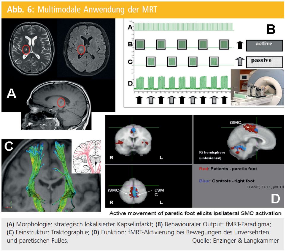 Die Dynamik der funktionellen zerebralen Aktivierungsänderungen, “spontan” im Verlauf eines Heilungsprozesses nach erworbener Hirnschädigung oder “induziert” nach bestimmten Interventionen, kann aufgrund der hohen Sensitivität der fMRT aber auch genützt werden, um Einblicke in zentrale Mechanismen der funktionellen Wiederherstellung zu generieren, oder um Konzepte zu den Effekten von Interventionen (Training, Medikamente) auch in kleineren Gruppen von Individuen zu prüfen (sog. “Proof-of-concept”-Studien). Dieser Punkt soll anhand zweier Beispiele unterschiedlicher neurologischer Erkrankungen illustriert werden: Zum einen beim Schlaganfall – als Modellerkrankung für fokale Gewebsschädigung an strategischer Lokalisation – und zum anderen bei multipler Sklerose (MS), als Modellerkrankung für chronische Akkumulation multilokulärer Gewebsalterationen unterschiedlichen Destruktionsgrades in verschiedenen Kompartimenten.