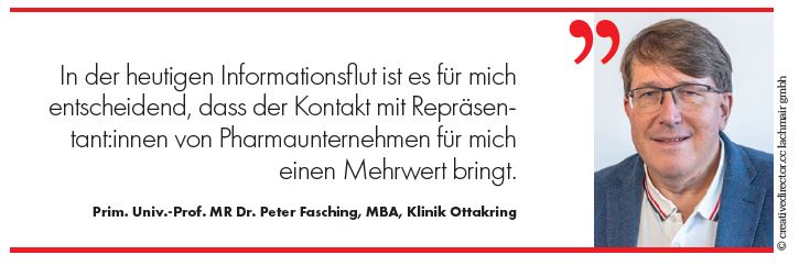 Generell wünscht er sich, dass er wegen konkreter Anliegen kontaktiert wird und dass klar formuliert wird, worum es sich handelt, z.B. gemeinsame Projekte, Veranstaltungen, wissenschaftliche Fortbildungen, Kongresse etc., „denn dann kann ich entscheiden, ob ich davon einen fachlichen Mehrwert habe. Dies gilt generell: Ich erwarte mir von den Repräsentant:innen einer Pharmafirma für meine eingesetzte Zeit als Gegenleistung einen wissenschaftlichen Mehrgewinn für meine Abteilung – egal, ob das jetzt ein:e Medical- oder ein:e Außendienstmitarbeiter:in ist“, unterstreicht Fasching.