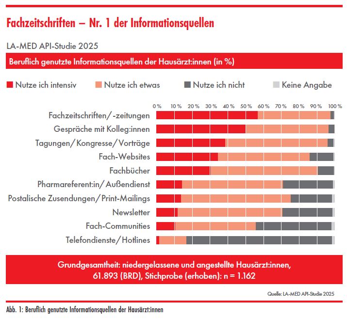 Für die berufliche Information und zur Fortbildung steht den Hausärzt:innen ein großer Strauß an Angeboten zur Verfügung, der sowohl Präsenzveranstaltungen als auch gedruckte und digitale Medien umfasst. Die Hausärzt:innen zeigen dabei laut LA-MED API-Studie 2025 eine sehr aktive Mediennutzung, die immer mehrere Kanäle kombiniert: Sowohl bei Fortbildung als auch bei allgemeiner Information und bei der Einordnung von Angeboten nach Relevanz für den Praxisalltag stehen jeweils Fachzeitschriften, Fortbildungen und Kongresse sowie der Austausch mit Kolleg:innen im Vordergrund (Abb. 1).