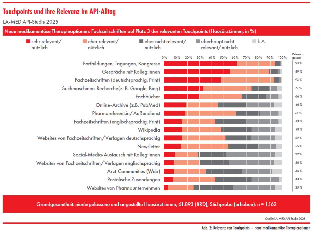Im Touchpoint Relevanz-Check der LA-MED API-Studie 2025 wird gezielt die Bedeutung der einzelnen Informationsangebote im Hinblick auf Alltagssituationen in der Arztpraxis unter die Lupe genommen. Bei den generell genutzten Informationsquellen führen dabei die Fachzeitschriften vor den Kollegengesprächen und Tagungen/Kongressen die Top 5 an, zu denen auch die Fach-Websites und Fachbücher zählen. Geht es im Praxisalltag um relevante Informationen über neue Therapieoptionen, zeigt sich ein ähnliches Bild: Hier wird das Spitzenquintett von Kongressen und Kollegengesprächen angeführt, gefolgt von den deutschsprachigen Fachzeitschriften, Suchmaschinen wie Google oder Bing und den Fachbüchern (Abb. 2).