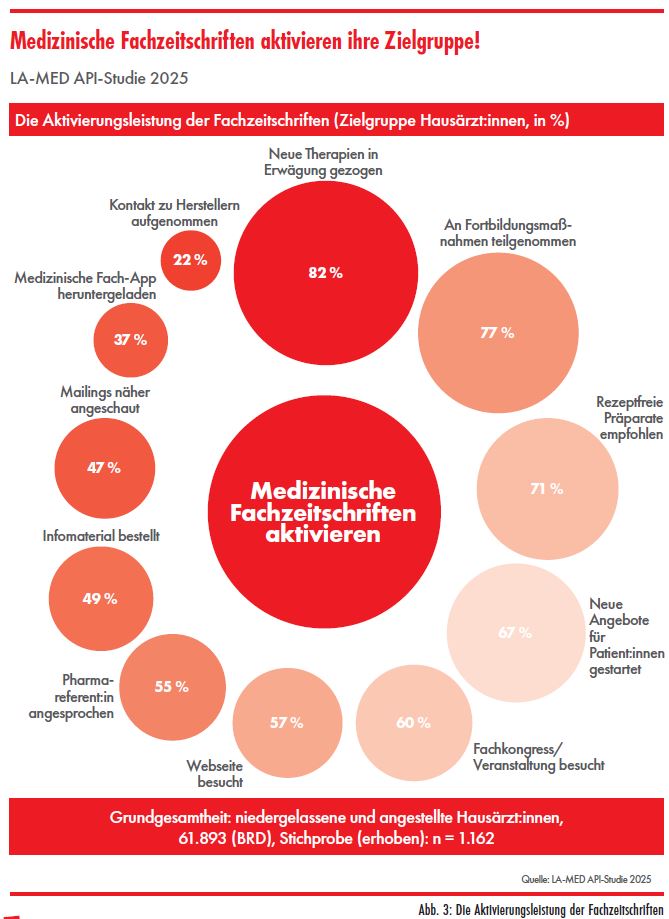 Wie der Aktivierungs-Check der LA-MED API-Studie 2025 zeigt, regt die Lektüre von Fachzeitschriften die Hausärzt:innen an, weitere Medien oder Informationsquellen zu nutzen. Zudem regt die Lektüre von Fachzeitschriften die Ärzt:innen zum Besuch von Kongressen, zu neuen Therapieoptionen und Angeboten für ihre Patient:innen sowie zu einer gezielteren Auseinandersetzung mit den Informationsangeboten der pharmazeutischen Industrie an (Abb. 3).