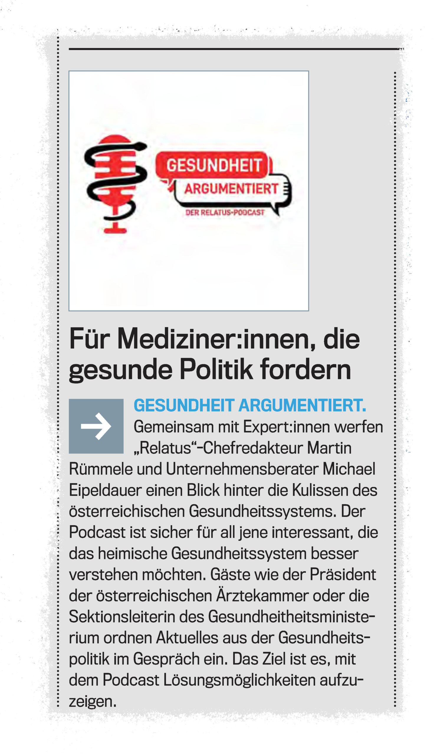Der Podcast „Gesundheit argumentiert“ ist so ein Format: RELATUS-Chefredakteur Martin Rümmele und der Gesundheitspolitik- und Strategieberater Michael Eipeldauer blickten bereits mit mehr als 50 Gästen hinter die Kulissen des heimischen Gesundheitswesens. Unter ihnen: 5 Gesundheitslandesrät:innen, die Präsident:innen von Ärztekammer, Apothekerkammer, Generikaverband, Pharmig, Apothekerverband, ÖGAM, Gesundheits- und Krankenpflegeverband, Vorsitzende von Sozialversicherungsträgern, ein Gesundheitsminister sowie unzählige Fachleute, die das Gesundheitssystem nicht nur bestens kennen, sondern auch ausführlich analysieren. Folge 50 bot mit Dr.in Susann Fiedler, Professorin am Institute for Cognition and Behavior an der Wirtschaftsuniversität Wien, einen Blick auf eines der zentralen Zukunftsthemen: Prävention, die Motivation zu einer gesünderen Lebensweise und was Verhaltensforschung und „Nudging“ dazu beitragen können.