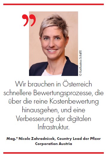 Dem österreichischen Gesundheitssystem attestiert die Geschäftsführerin von Pfizer Austria eine Vielzahl von Stärken, darunter gut ausgebildete Fachkräfte und ein sehr gutes Versorgungssystem, das darauf abzielt, alle Patient:innen bestmöglich betreuen zu können. „Wir haben in Österreich ein Gesundheitssystem, auf das wir stolz sein können, an dem wir aber kontinuierlich weiterarbeiten müssen, damit das auch so bleibt“, betont Zahradnicek. Denn sie sieht auch kleine Schwachstellen: So dauert es ihrer Ansicht nach bei innovativen Therapien im EU-Vergleich in Österreich manchmal länger, bis diese bei den Patient:innen tatsächlich ankommen. Hier ortet sie Verbesserungspotenzial, denn: „Das ist wertvolle Zeit, die den Betroffenen zugutekommen kann und soll!“ Damit dies gelingt, brauche es u.a. transparente und schnelle Entscheidungsprozesse in Bezug auf Erstattung und Nutzenbewertung, so Zahradnicek. Ihr Appell an alle Entscheidungsträger: „Ich würde mir wünschen, dass wir diesbezüglich die Zusammenarbeit stärken, damit Entscheidungen schneller getroffen werden können, und dass Nutzenbewertungen von Therapien über die klassische kurzfristige Kostenbeurteilung hinausgehen.“