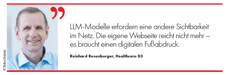 Reinhard Rosenberger, Managing Director von Healthcare D3, gibt zu bedenken, dass GEO von der Seite der User:innen aus gedacht werden muss. „Und diese sind im Internet zumeist auf der Suche nach etwas: einem Produkt, einer Information etc.“ Diese Suche findet aber nicht nur über Suchmaschinen und KI-Bots statt, sondern beispielsweise auch in Social Media. „Daher brauchen Unternehmen einen digitalen Fußabdruck, das heißt, sie müssen auch auf anderen Plattformen präsent sein, nicht nur über eine eigene Website“, empfiehlt Rosenberger. Bezogen auf ein Pharmaunternehmen bedeutet das: „Man muss entlang der Patient Journey permanent präsent sein. Wer diese Onlinepräsenz erreicht, profitiert davon auch bei GEO, denn die KI findet dadurch Informationen des Unternehmens auch in anderen Quellen“, weiß Rosenberger aus der Praxis.