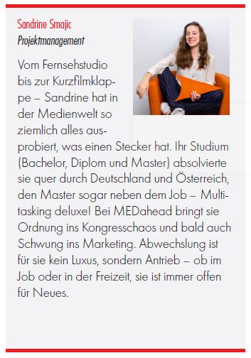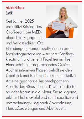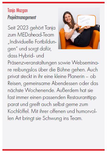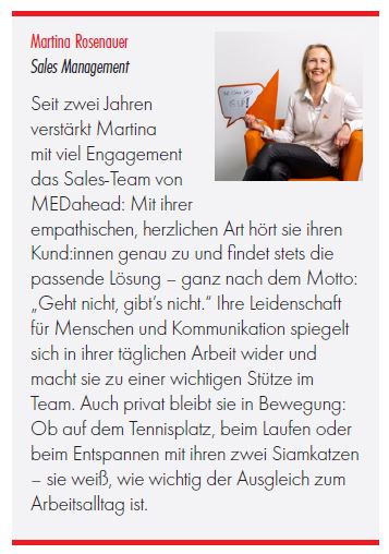 Zur RegistrierungVor einiger Zeit haben wir Ihnen bereits einen Teil unseres Teams präsentiert. Seither hat sich MEDahead weiterentwickelt: Neue Kolleg:innen sind zu uns gestoßen und bereichern unser Unternehmen mit frischen Impulsen und vielfältigen Perspektiven. Mit dem erweiterten Know-how und der neuen Motivation verstärken sie unser Team und tragen dazu bei, dass wir unsere Abläufe optimieren, Innovationen vorantreiben und unser Angebot kontinuierlich ausbauen – immer mit dem Ziel, individuelle und hochwertige Lösungen zu bieten.