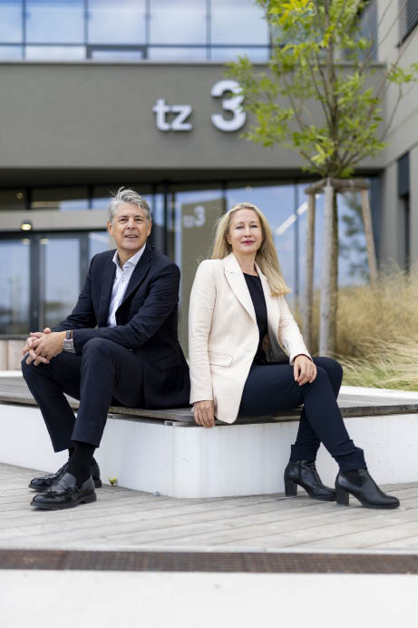 Martin Munte (CEO Vaccentis) und Ingrid Rauter (Head of R&D and CMO Vaccentis) vor dem neuen Standort in Wien; © Vaccentis / Martin Steiger
