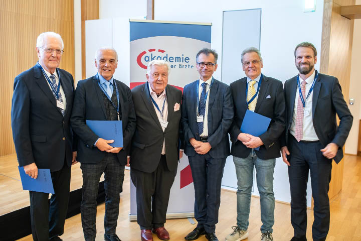 v.l.: Univ.-Prof. Manfred Dierich (Gründungsmitglied), Univ.-Prof. Heinrich Klech (Gründungsmitglied), Univ.-Prof. Heinrich Weber (Gründungsmitglied), Dr. Peter Niedermoser (Präsident des wissenschaftlichen Beirats der Akademie der Ärzte), Dr. Wolfgang Routil (Gründungsmitglied) und Mag. Günther Ochs (Geschäftsführer der Akademie der Ärzte); © Stefan Seelig