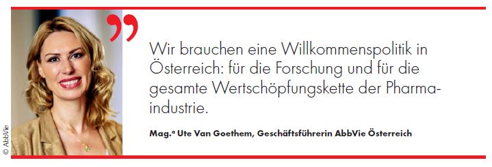 Die Stärkung Österreichs als Produktions- und Forschungsstandort ist Van Goethem, wie bereits erwähnt, ein großes Anliegen: „Gerade im Hinblick auf die Forschung sind wir sehr stolz, dass AbbVie derzeit in Österreich 37 Projekte durchführt. Wir haben ein eigenes Clinical-Operations-Team, das sich dafür engagiert, Forschung in Österreich voranzutreiben.“ Dies ist in ihren Augen von großer Bedeutung, denn dadurch können Ärzt:innen hierzulande „an der Speerspitze der Innovation arbeiten, zudem haben Patientinnen und Patienten dadurch frühestmöglich Zugang zu innovativen Therapien“.