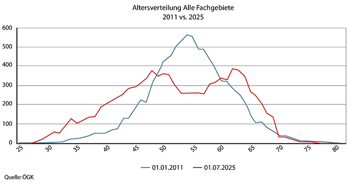 Im Alter von 45 bis 55 Jahren ist für viele Kassenärzt:innen Schluss mit der Arbeit im Kassen-Gesundheitssystem. Sie verlassen es und eröffnen eine Wahlarztordination, um in ihren späteren Jahren im Beruf dort statt in der Kassenordination oder im öffentlichen Spital Patient:innen zu versorgen. Das geht aus neuen Daten der Österreichischen Gesundheitskasse (ÖGK) hervor, die RELATUS MED und der Ärzte Krone exklusiv vorliegen. Die Daten zeigen auch, dass junge Ärzt:innen im Alter von 30 bis 35 Jahren heute entgegen der aktuellen Debatte sogar vermehrt in das Kassen-Gesundheitssystem gehen: Aktuell, 2025, sind dort doppelt bis dreimal so viele beschäftigt als 2011.