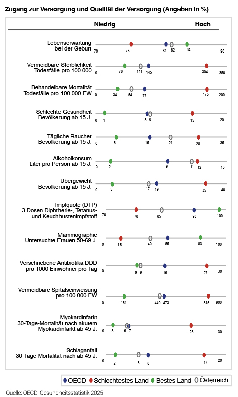 Auch in Hinblick auf Risikofaktoren schneidet Österreich laut OECD-Studie schlecht ab: Die Raucherquote in Österreich lag mit 20,6 % über dem OECD-Durchschnitt von 14,8 %. Der Alkoholkonsum war mit 11,3 Litern pro Kopf in Österreich höher als der OECD-Durchschnitt von 8,5 Litern. 23 % der Erwachsenen in Österreich trieben nicht ausreichend Sport, was unter dem OECD-Durchschnitt von 30 % liegt. Dazu kommen Lücken im Bereich der Vorsorge: In Österreich waren 85 % der Kinder gegen Diphtherie, Tetanus und Keuchhusten (DTP) geimpft, was unter dem OECD-Durchschnitt liegt. 40 % der Frauen in Österreich nahmen an einem Brustkrebs-Screening teil, weniger als der OECD-Durchschnitt von 55 %. Und selbst dort, wo Österreich über dem Schnitt liegt, ist man nicht das beste Land: Die 30-Tage-Mortalität nach einem akuten Myokardinfarkt (AMI) betrug in Österreich 6,0 % (OECD-Durchschnitt 6,5 %) und nach einem Schlaganfall ebenfalls 6,0 % (OECD-Durchschnitt 7,7 %), basierend auf nicht verknüpften Daten. Alle diese Werte – und da stimmen OECD und Rechnungshof überein – haben mit den Strukturen des Gesundheitswesens und nicht mit der Arbeit Beschäftigten zu tun. In vielen Fällen kämpfen sie sogar mit den schlechten Rahmenbedingen. (rüm)