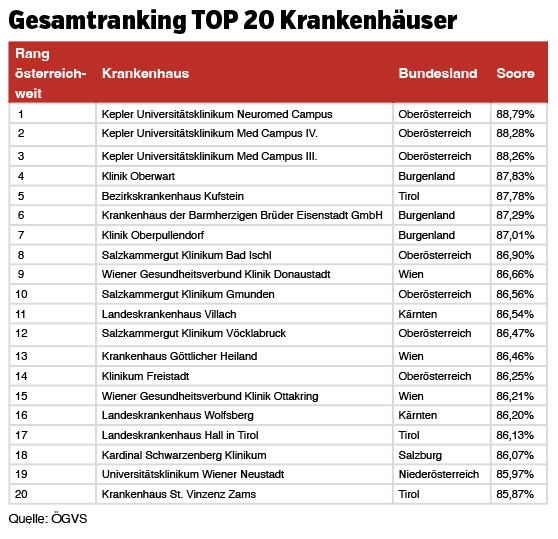Im österreichweiten Vergleich wurden 20 % der insgesamt 174 Krankenhäuser als „Herausragend“ ausgezeichnet. Vor allem Oberösterreich hatte die Nase vorn: Die ersten drei Plätze gingen an das Kepler Universitätsklinikum, gefolgt von der Klinik Oberwart und dem Bezirkskrankenhaus Kufstein. (tab)