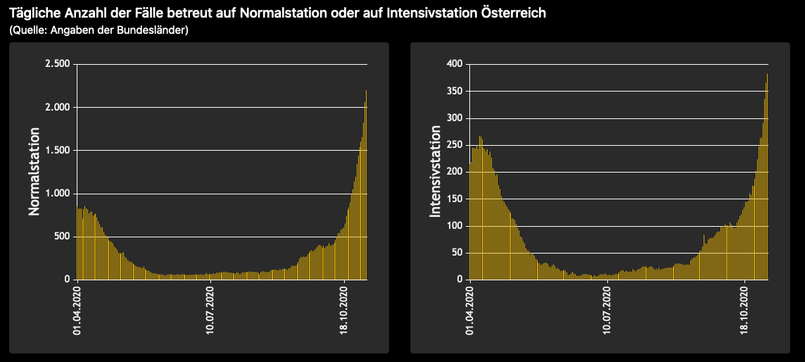 Mit Stand 9.30 Uhr meldete das Innenministerium am Donnerstag 2.737 Personen, die aufgrund des Corona-Virus in krankenhäuslicher Behandlung waren, davon 407 auf Intensivstationen. Am Mittwoch ist die Zahl der Neuinfektionen binnen 24 Stunden erstmals auf über 6.000 Fälle gestiegen. Damit wurde jener Punkt erreicht, den Experten in der vergangenen Woche als Grenze für das Kippen der Gesundheitsversorgung nannten. Die Zahl der Intensivpatienten stieg in einer Woche um mehr als 70 Prozent.