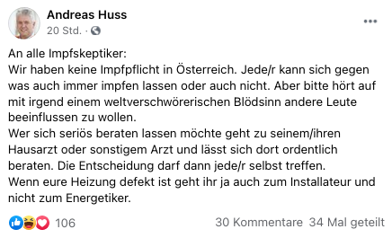 Andreas Huss, Obmann der ÖGK, ist richtig sauer. Der „Blödsinn“, den „Weltverschwörer“ in sozialen Medien verbreiten, wie er sagt, entbehre jeder Grundlage und verunsichere die Menschen. „An alle Impfskeptiker: Wir haben keine Impfpflicht in Österreich. Jede/r kann sich gegen was auch immer impfen lassen oder auch nicht. Aber bitte hört auf mit irgendeinem weltverschwörerischen Blödsinn andere Leute beeinflussen zu wollen“, schreibt Huss in einem Posting auf Facebook. Und weiter: „Wer sich seriös beraten lassen möchte geht zu seinem/ihren Hausarzt oder sonstigem Arzt und lässt sich dort ordentlich beraten. Die Entscheidung darf dann jede/r selbst treffen.“ Nachsatz: „Wenn eure Heizung defekt ist geht ihr ja auch zum Installateur und nicht zum Energetiker.“ Er habe sich einfach über die Diskussionen im Internet geärgert, sagt Huss im RELATUS-Interview. Er habe sich auf der Basis des Impfschadensgesetzes angesehen, wie viele Impfschäden es seit 1973 gegeben hat: Es waren 409.