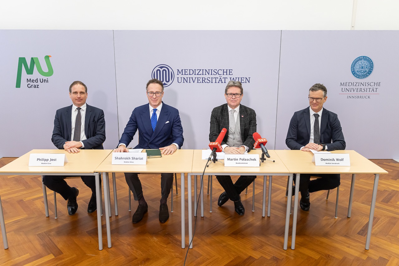 v.l.: Philipp Jost (MedUni Graz), Shahrokh Shariat (MedUni Wien) Martin Polaschek (Wissenschaftsminister), Dominik Wolf (MedUni Innsbruck). (c) Medizinische Universität Wien/APA-Fotoservice/Juhasz Mehrere österreichische Medizinuniversitäten haben das neue „Austrian Comprehensive Cancer Network“ gegründet. Am Dienstag wurden Pläne und Ziele präsentiert.