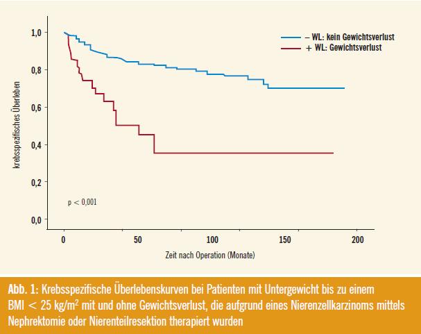 Als ursächlich werden u. a. höhere Level an humanen Wachstumsfaktoren im Fettgewebe, höhere Östrogenspiegel und die Wirkung von Insulin vermutet, als weitere potenzielle Risikofaktoren werden arterielle Hypertonie und eine immunologische Dysregulation diskutiert7. Andererseits wurde basierend auf den Ergebnissen einzelner Studien beschrieben, dass übergewichtige und adipöse Nierenzellkarzinom-Patienten eine bessere Prognose und ein günstigeres Krankheitsprofil aufweisen als normgewichtige Patienten8–17, 21. Haferkamp et al. veröffentlichten zudem Ergebnisse einer Studie, die Untergewicht als ungünstigen prognostischen Faktor hinsichtlich des krebsspezifischen Überlebens (CSS) bei operativ therapierten Patienten wertet16. Unklar ist jedoch, welchen Einfluss ein präoperativ vorhandener Gewichtsverlust auf das Überleben hat.