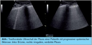 Bei chronischer Polyarthritis (RA) ist das Leitsymptom die Zerstörung der Gelenke durch einen die Knorpel und Knochen betreffenden erosiven Verlauf aufgrund der Proliferation der Synovia. Unbehandelt kann diese Erkrankung zur Invalidität führen. Die Freisetzung von Zytokinen, wie z. B. IL-1 oder TNF-alpha, führen zu einer Destruktion des Gewebes. Glücklicherweise kommen durch die frühzeitige Therapie mit Methotrexat, Leflunomid, Immunsuppressiva und den so genannten Biologika schwere Verlaufsformen nur mehr selten vor. Neue Diagnosekriterien und der frühzeitige Einsatz von Kombinationstherapien ermöglichen eine suffiziente Behandlung und ein besseres Outcome.8 Extraartikuläre Manifestationen der rheumatoiden Arthritis (RA) galten bis dato als eher selten. In aktueller Literatur wird berichtet, dass 23 % der PatientInnen einen Lungenbefall haben und dass besonders PatientInnen mit anticitrullinierten Antikörpern (aCCP) und positivem Rheumafaktor (IgA) eine ILD entwickeln können.4 Wir fanden sogar mittels Lungenultraschall, einer strahlenfreien Methode, bei 18 % respiratorisch beschwerdefreien RA-PatientInnen Lungenveränderungen, die sich mittels HRCT bestätigten (> Abb.). Interessant ist, dass unter TNF-Therapie granulomatöse Veränderungen in der Lunge bei RA-PatientInnen beschrieben wurden.9 Bis dato gibt es noch keine Studie, die zeigt, ob diese Veränderungen durch die Medikamente selbst induziert werden oder ob es bei bereits bestehender ILD zu einer Progredienz kommen kann. TNF-alpha- Blokker-Therapien werden bei idiopathischer ILD nicht eingesetzt, weil es zu einer Verschlechterung der Fibrose kommen kann.10–12