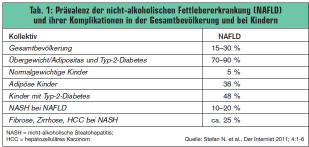 Ein besonders hohes Risiko für die Entwicklung einer Fettleber haben Typ-2-Diabetiker. Bei ihnen liegt die Prävalenz der NAFLD/NASH bei 75 %. Bemerkenswerterweise sind bei diesen Patienten die Transaminasen (ALT, AST) oft nicht oder kaum erhöht. > Tab. 1 gibt einen Überblick über die Prävalenz NAFLD und ihrer Komplikationen in der Gesamtbevölkerung und bei Kindern.