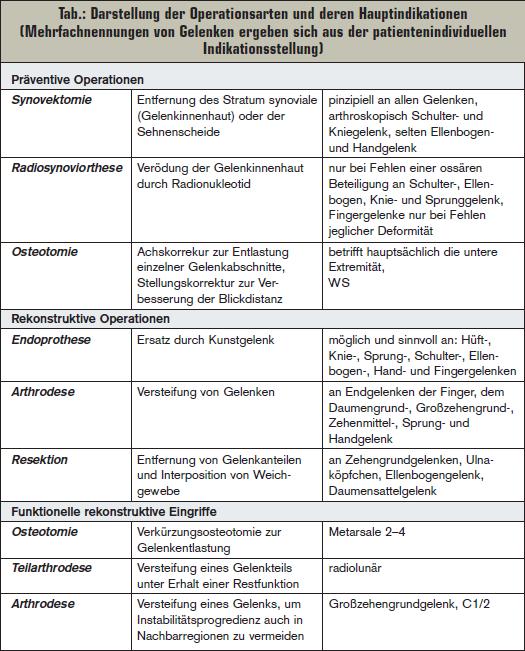 Die erste Gruppe rekrutiert sich aus Patienten mit fehlendem Therapieansprechen, Therapieabbrechern und auch nur oligoartikulären Residuen trotz guten medikamentösen Ansprechens; in diesen Fällen ist die Entscheidung zu einem operativen Vorgehen entsprechend der Destruktionsgrade leicht indizierbar. Die Wahl der Eingriffe richtet sich nach der Gelenksituation und berücksichtigt Gelenkstellung, Knorpelzustand und Bandverhältnisse. Entsprechend den radiologischen Scores (Larsen- Dale-Eyk) kann man zwischen gelenkerhaltenden und rekonstruktiven Eingriffen wählen. Die Situation des Patienten führt in der Regel zu einer orthopädischen Beratung, die – eine gute medikamentöse Einstellung vorausgesetzt – die Operation ermöglicht.